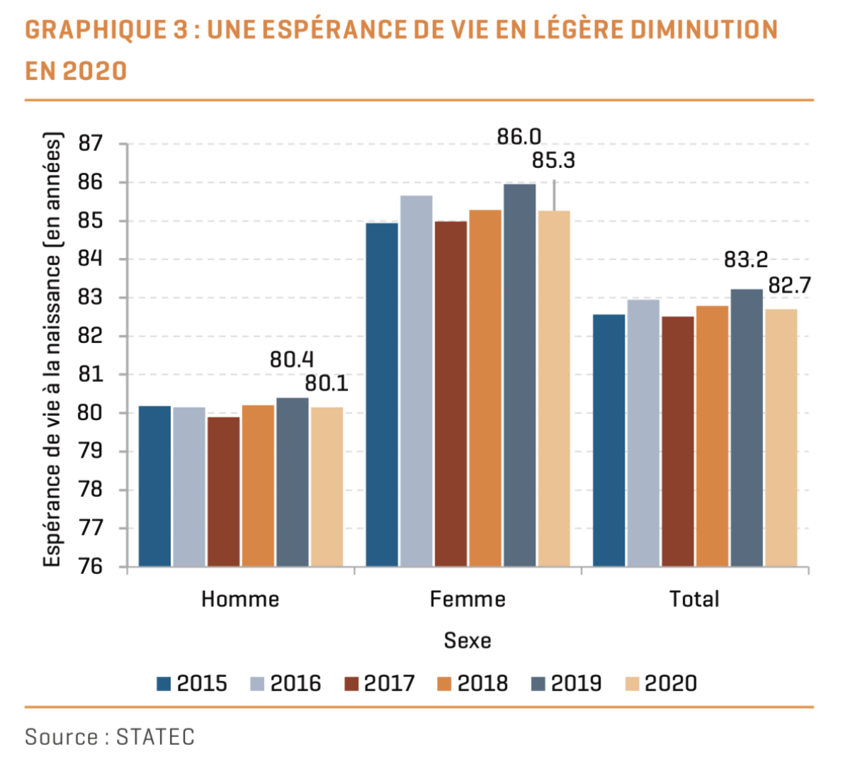 In 2020, life expectancy at birth is birth for women is 85.3 years and 80.1 years for men. Compared to 2019, this life expectancy has decreased by 0.3 years for men and 0.7 years for women.