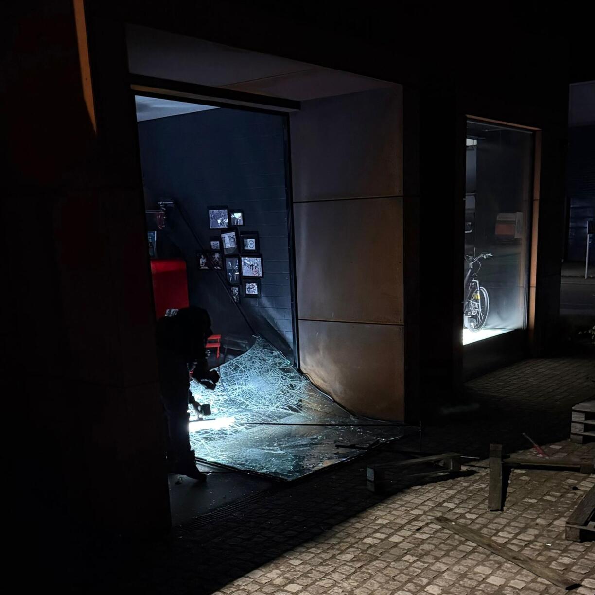 Two, sometimes four bicycles at a time, the burglars moved through the shop at pace, the rattling of bike frames audible on the surveillance footage. The images also tell the story of the damage left behind: a completely shattered window and overturned bicycle racks strewn across the shop floor.