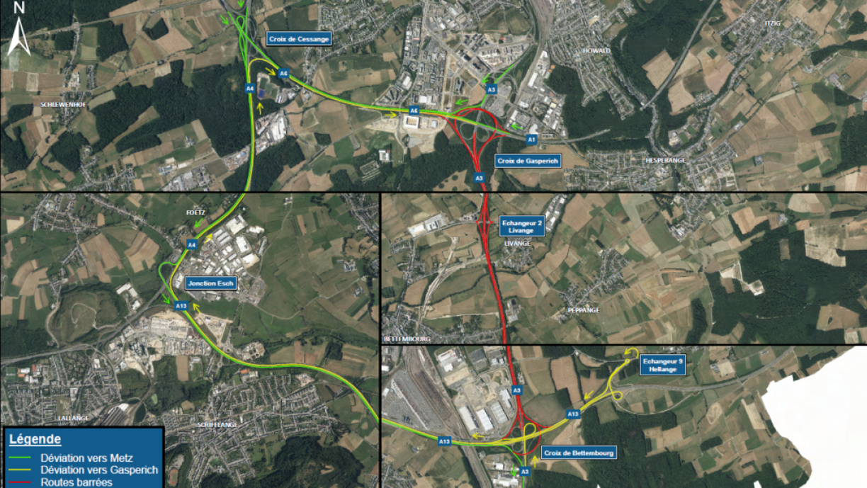 The A3 will be shut between the Gasperich and Bettembourg intersections from 8pm on 21 May until 6am on 24 May. Diversions will be installed via the A13, A4, and A6 motorways.