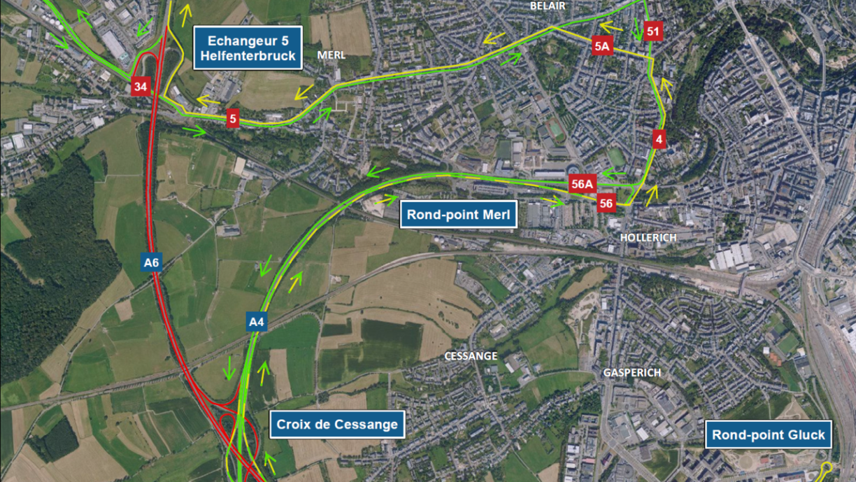 Traffic from the A6 motorway, direction Gasperich, will be redirected at the Helfenterbruck intersection via the N34, the N5, the N51, the N4, the N56A, the A4, and the Cessange intersection back to the A6 motorway.