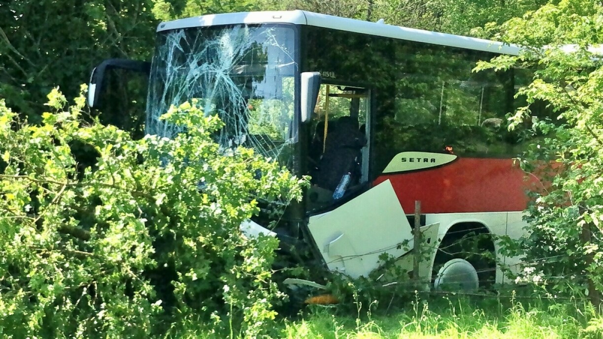 The driver lost control of his bus just before making a turn and ended up coming to a halt in a hedge-lined ditch.