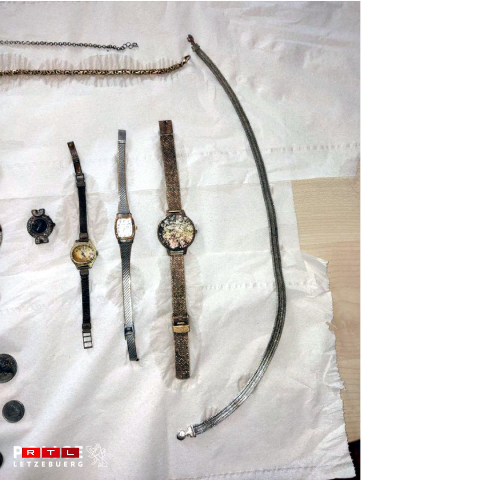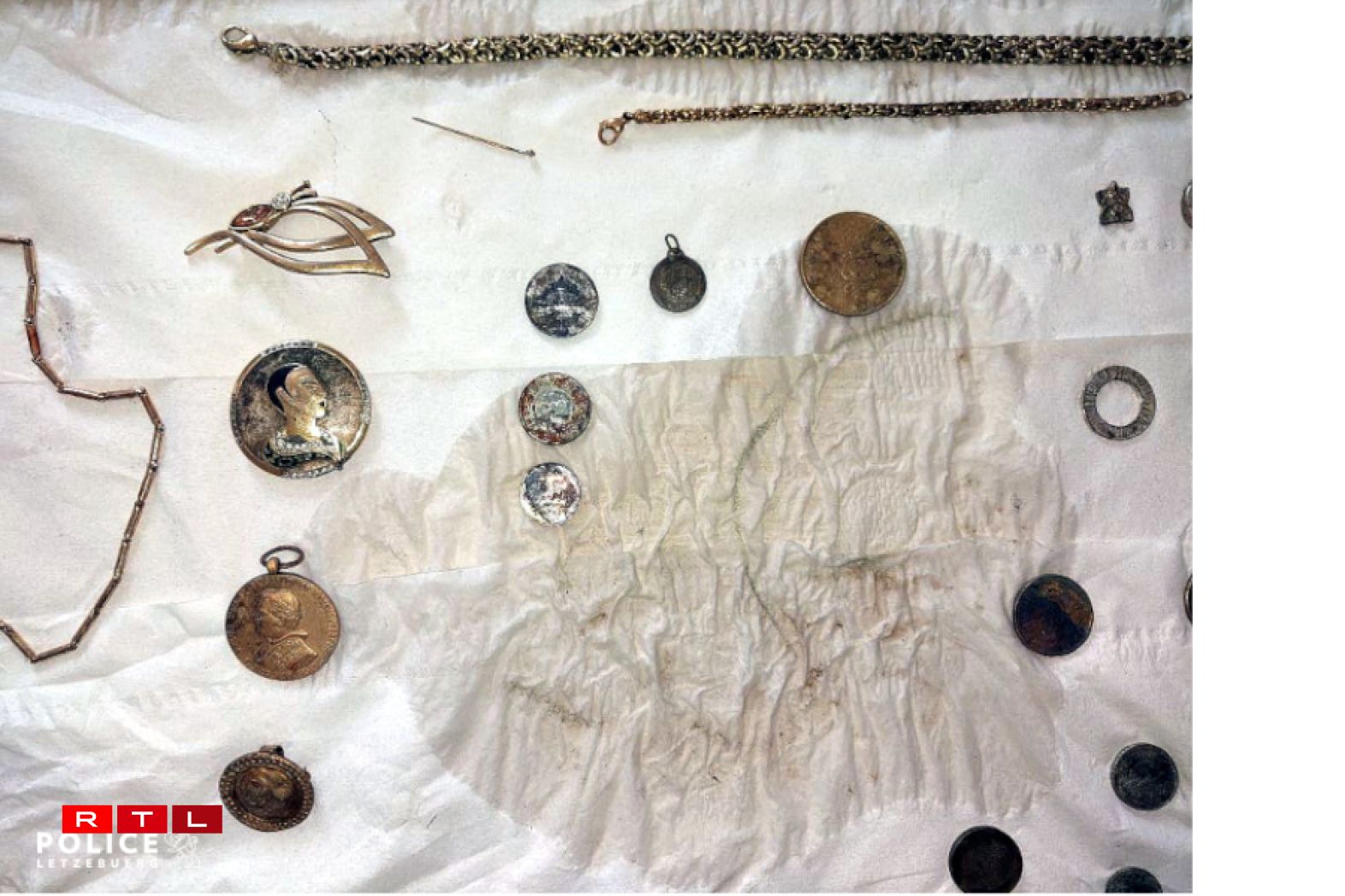 The recovered property includes several antique gold watches, necklaces, coins, and assorted pieces of jewellery.