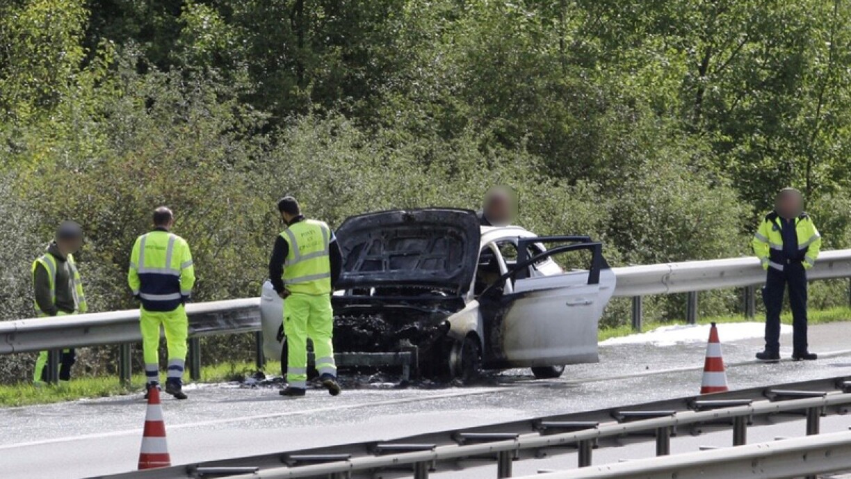 The burning car was located on the motorway section in the direction of Fridhaff. The emergency lane was blocked and the right lane shut to allow emergency services access.