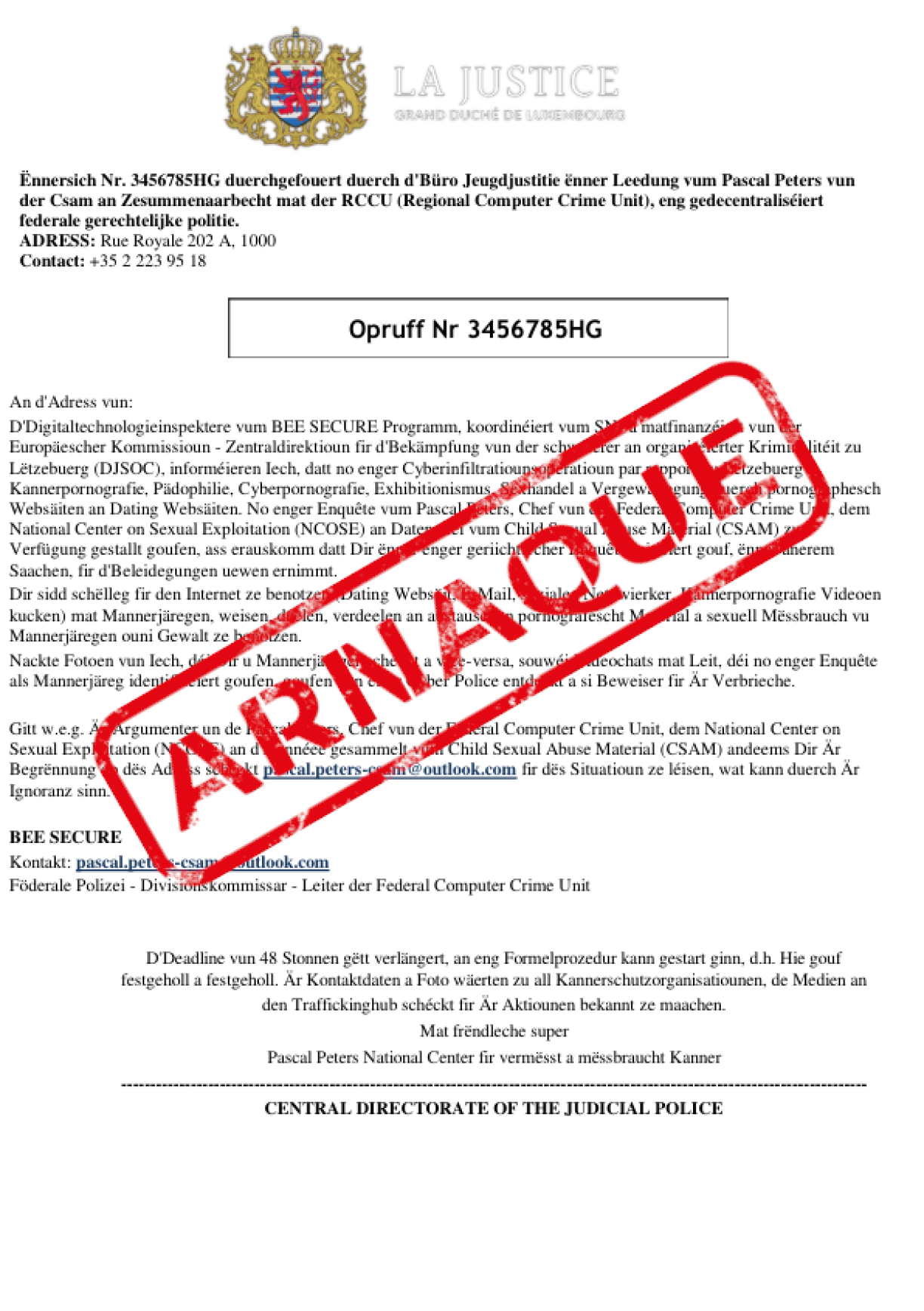 The Grand Ducal police said a number of people had received fake emails purporting to be from the police themselves, as well as from Bee Secure, the Luxembourg judiciary, and foreign police authorities.