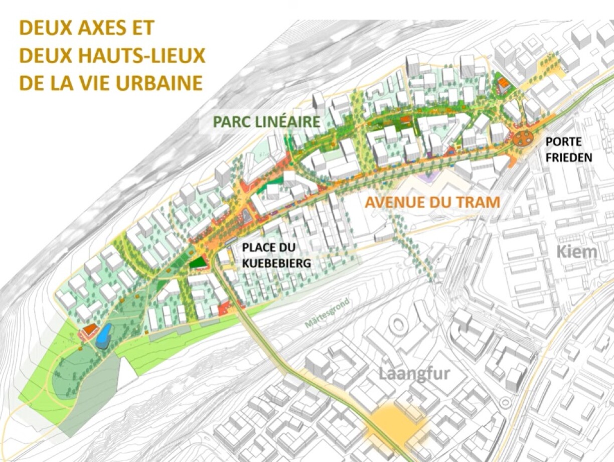 Aside from focusing on nature, the new residential district should also become a vibrant and dynamic living space. The Ministry for Mobility and Public Works and the Kirchberg Fund thus envision two new squares at the northern end of Kirchberg: the ‘Porte Frieden’ and the ‘Place du Kuebebierg’.