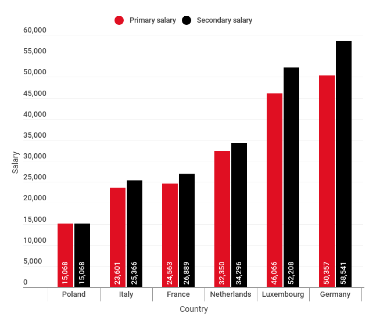 Again, on an unadjusted basis Luxembourg’s starting salary is higher at €78,286, compared to €62,296 in Germany.