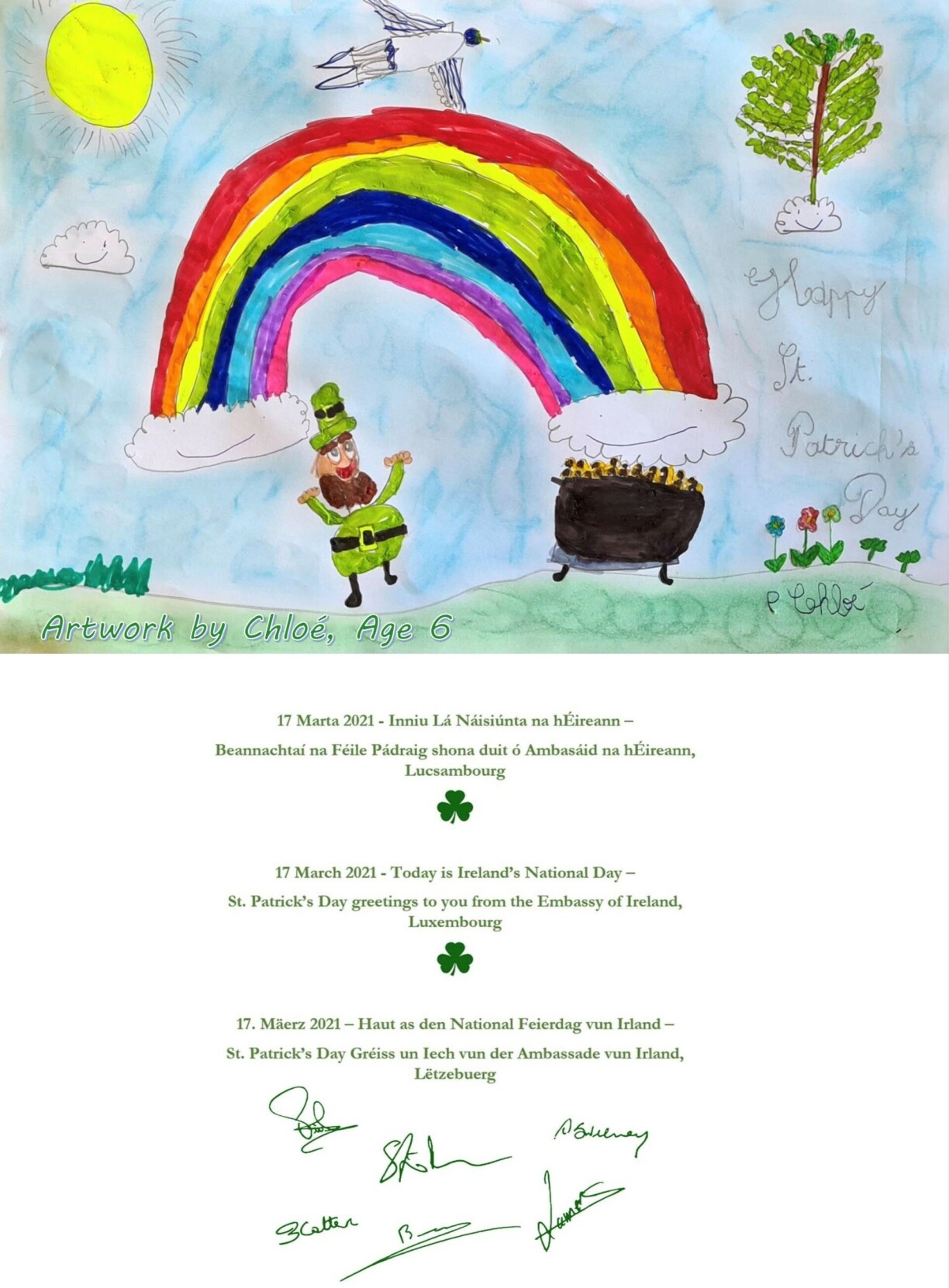 The embassy also sent out this delightful Saint Patrick’s Day card, which this year uses the picture created by Chloé, age 6, one of the winners of the embassy's children’s art competition.