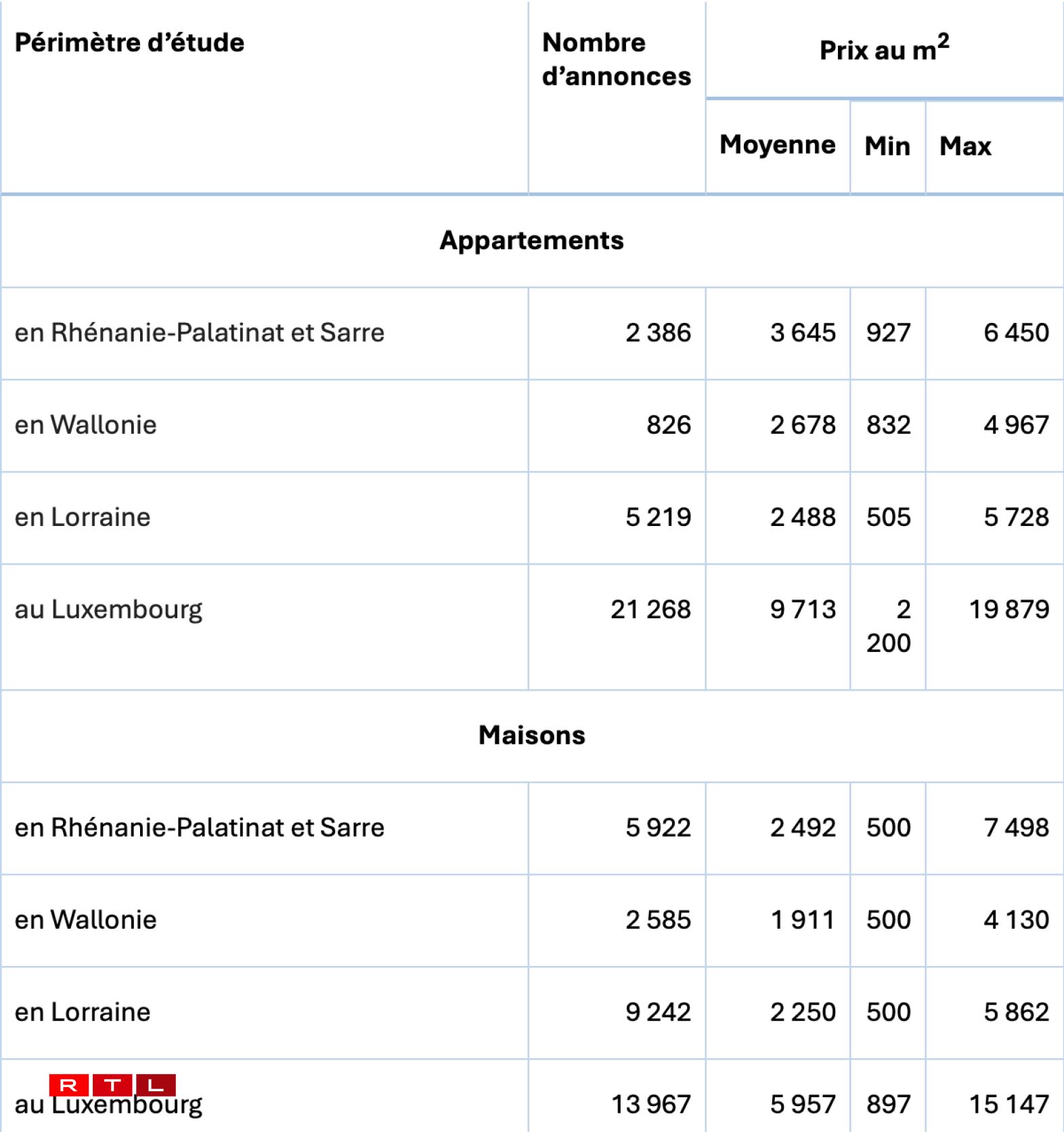 As for houses, although the average price is well below that in Luxembourg (€5,957 per square metre), this does not prevent prices from climbing to over €15,000 per square metre, according to LISER. This is twice as much as the maximum prices observed on the German border and almost three times as much as in Lorraine. Wallonia, meanwhile, has the lowest house prices in the region (€2,585 per square metre on average).