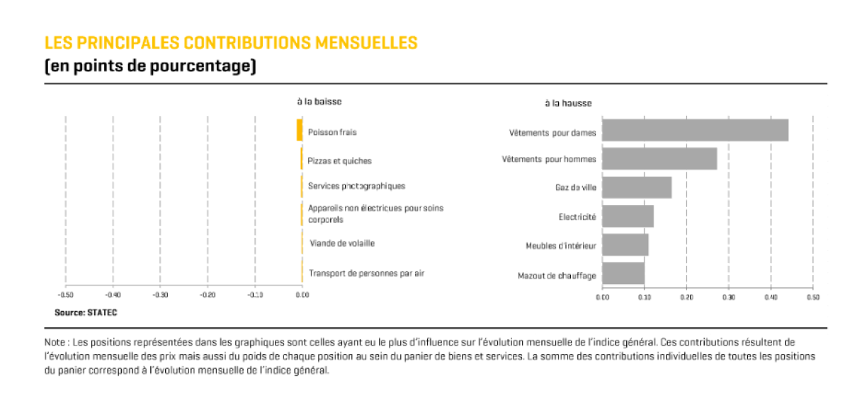 Elsewhere, prices for clothing and shoes have risen by almost 16%. Grocery items such as pizza (-2,9%), fresh fish (-3,4%) or honey and jam (-2,7%) have dropped, in contrast.