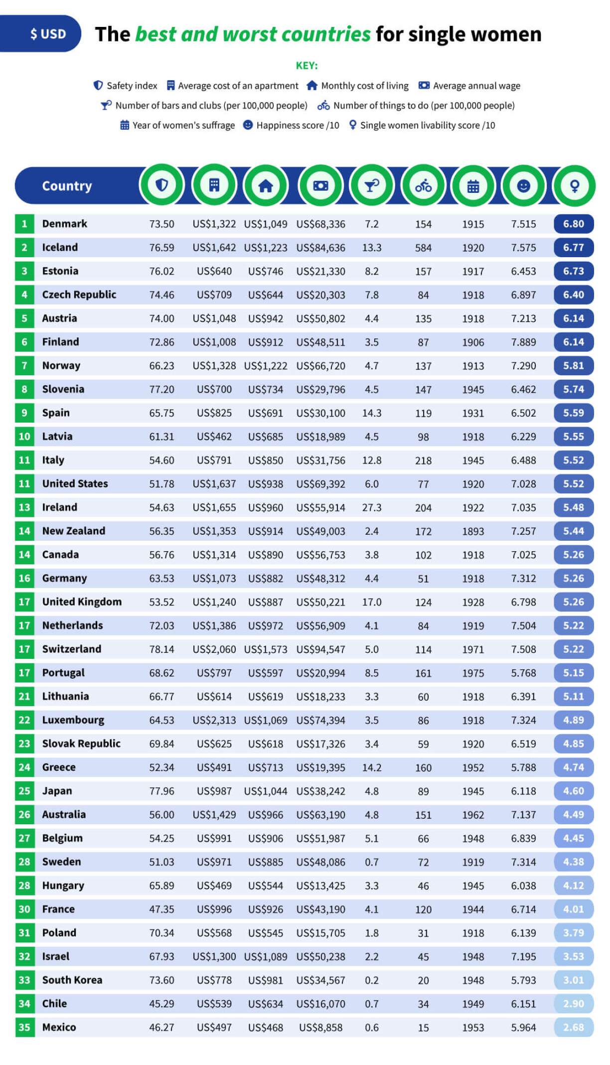 The index compares eight different factors: a safety index; apartment costs; monthly cost of living; the average annual wage; the number of bars and clubs (population weighted); the number of things to do on TripAdvisor (population weighted); the year that women gained equal voting rights to men; and the happiness score from the World Happiness Report.