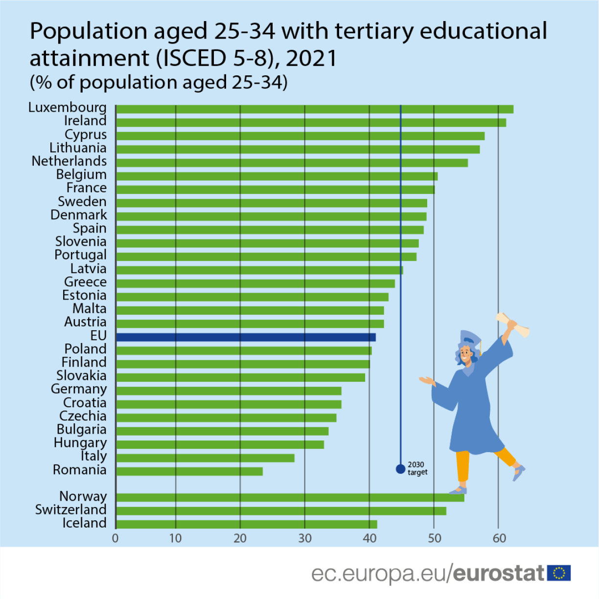 This is way above the EU average of 41%, indicating that Luxembourg’s young people are particularly well-educated when compared to their European peers.
