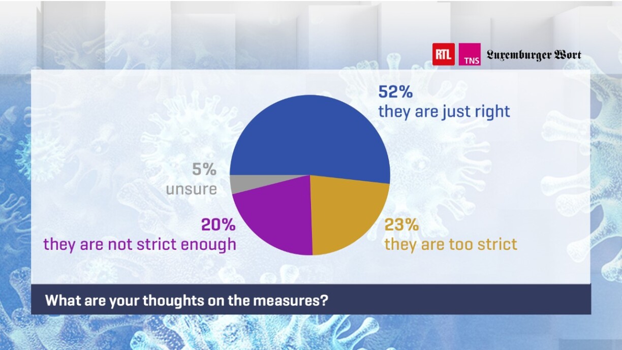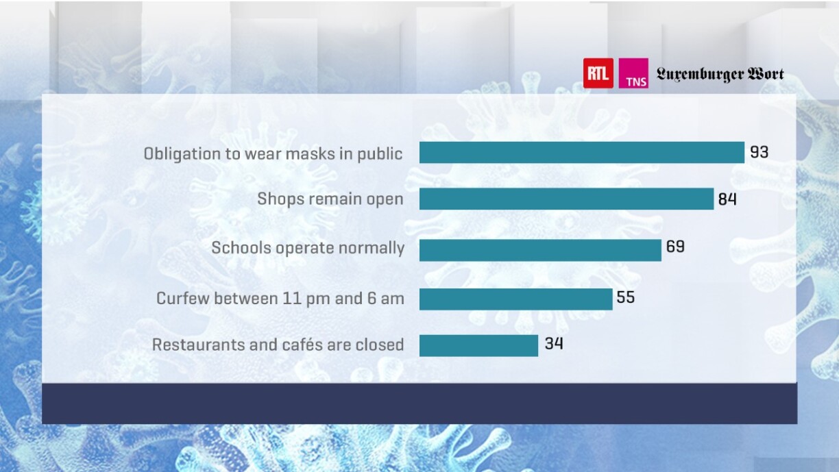 However, it should be noted that two measures are especially unpopular with the Grand Duchy's residents: the 11 pm to 6 am curfew is approved by only 55% of the population, and above all the closing of restaurants and pubs is approved by only 34% of those polled.