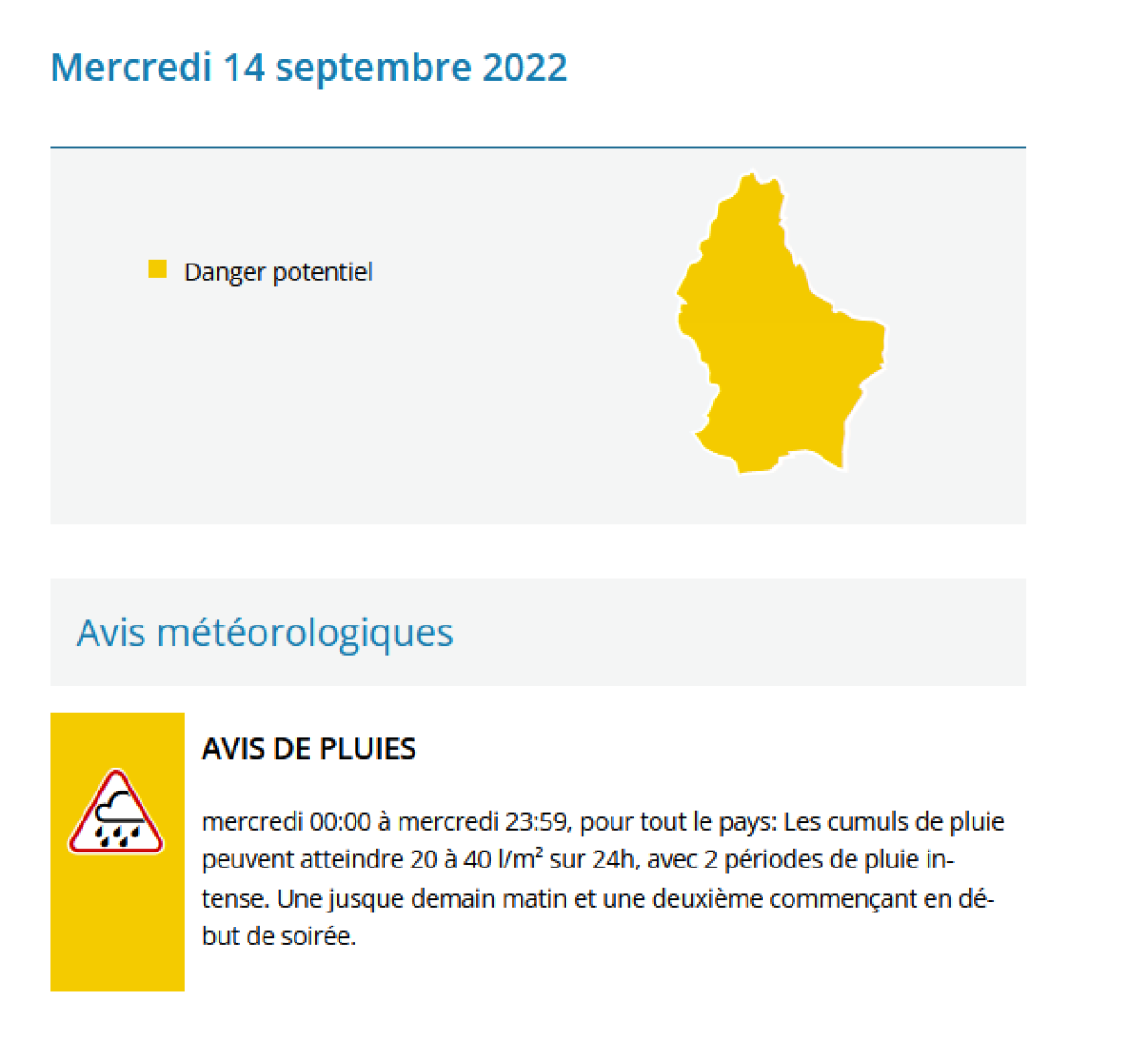 According to Meteolux, we can expect heavy rainfall throughout Wednesday. Daily rain accumulation can reach up to 20 l/m² in a short time.
