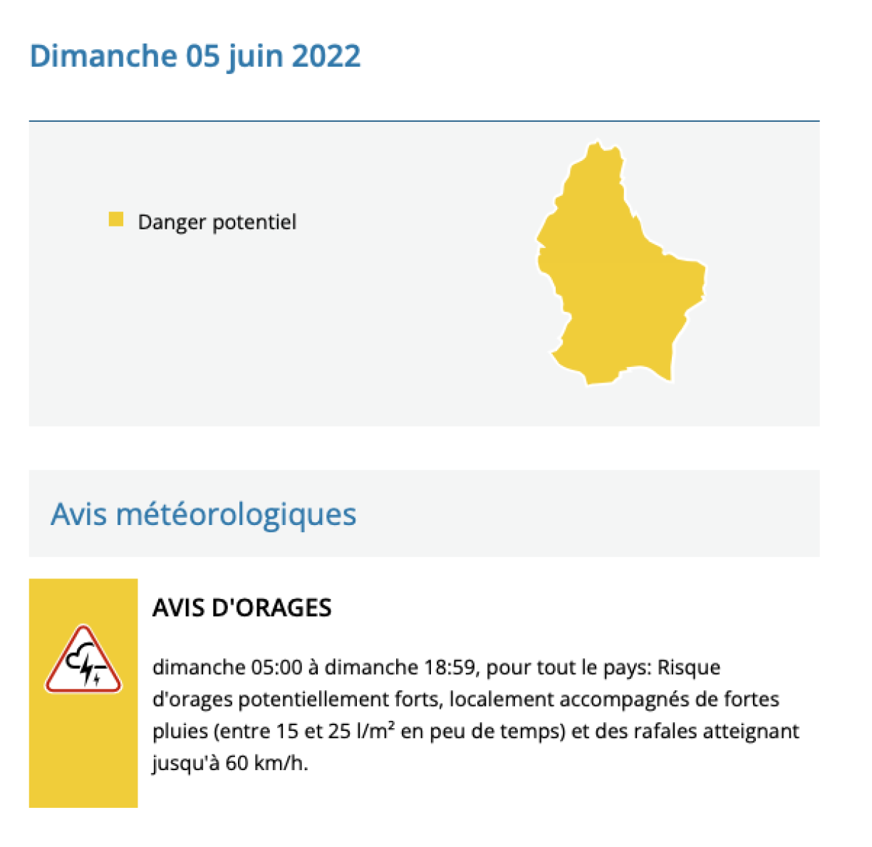 The Findel meteorological station announced that “potentially strong” storms and heavy rain are to be expected. 15 to 25 litres of water may accumulate per square metre, which may lead to disruptions in traffic. Wind gusts may reach speeds of up to 60 km/h.