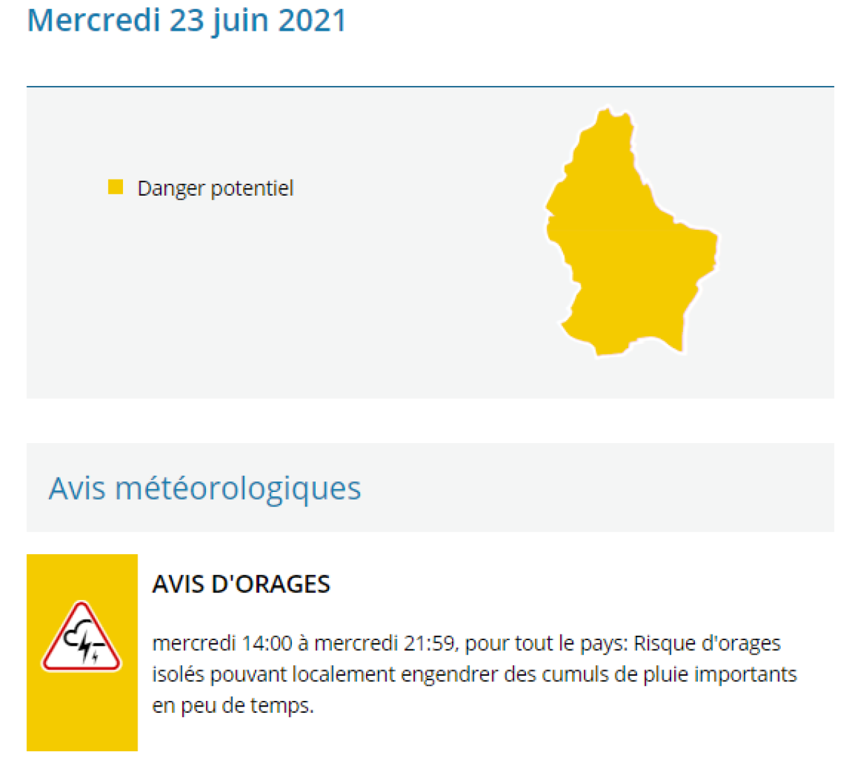 In fact, Meteolux has issued a nationwide yellow alert, valid between 2 pm and 10 pm, because of "thunderstorm risks that could locally lead to heavy rainfall in a short amount of time".