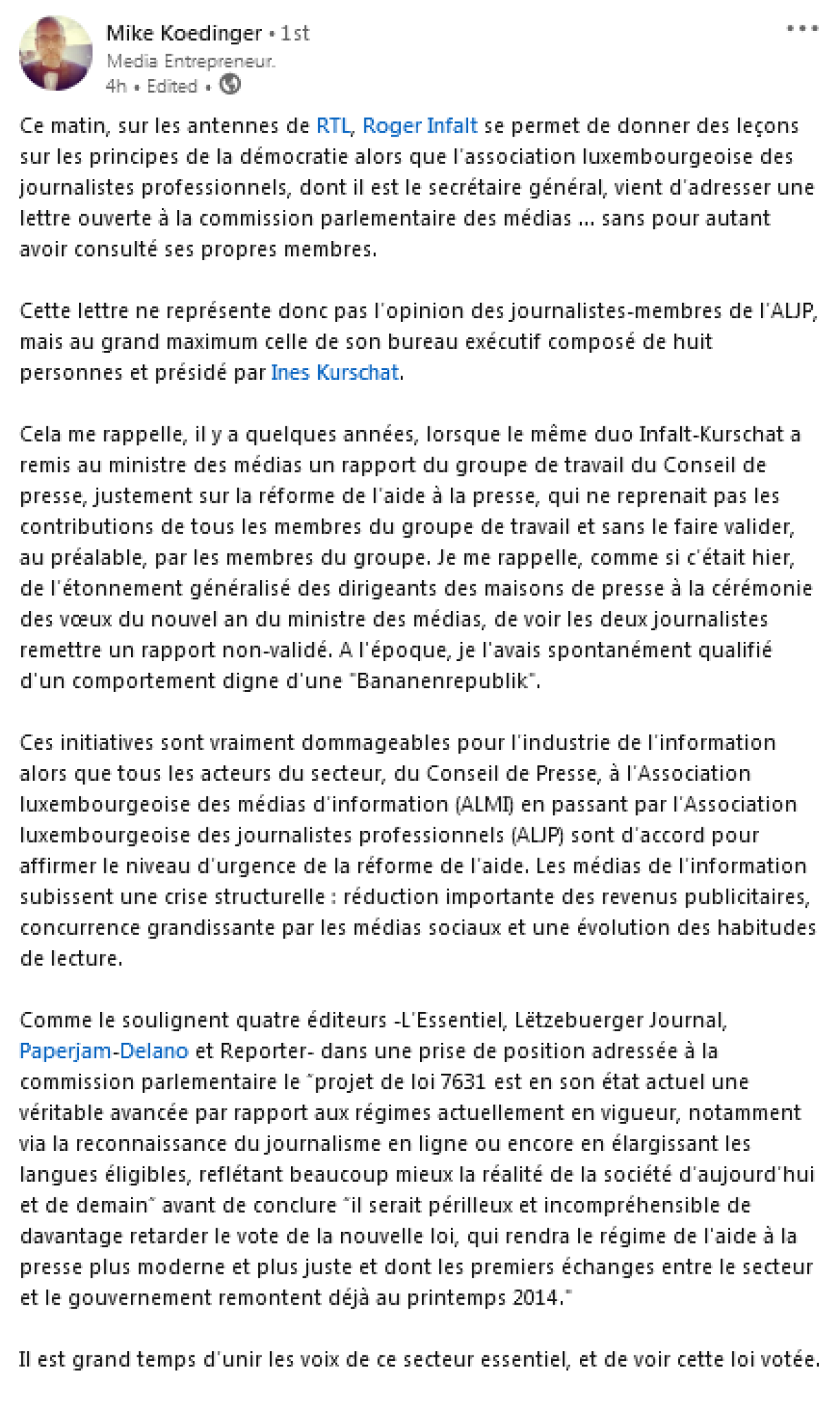 Mike Koedinger is the head of the Maison Moderne publishing house. In a Facebook post, Koedinger expressed his bewilderment that Infalt would preach about democracy, even though the Luxembourg Association of Journalists (ALJP), according to Koedinger, sent an open letter to the Parliamentary Media Commission without consulting its members first.