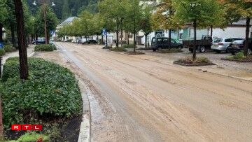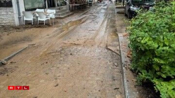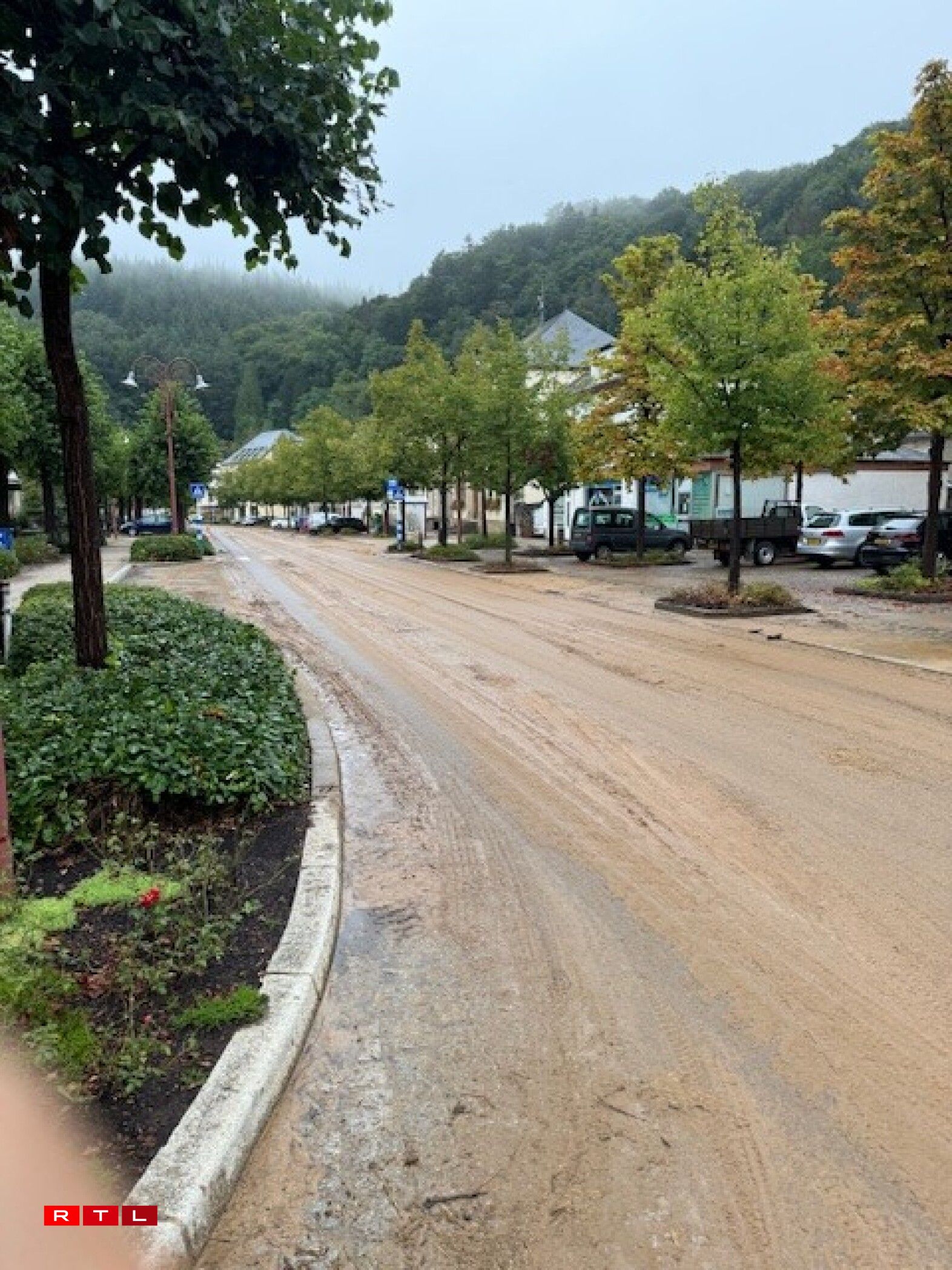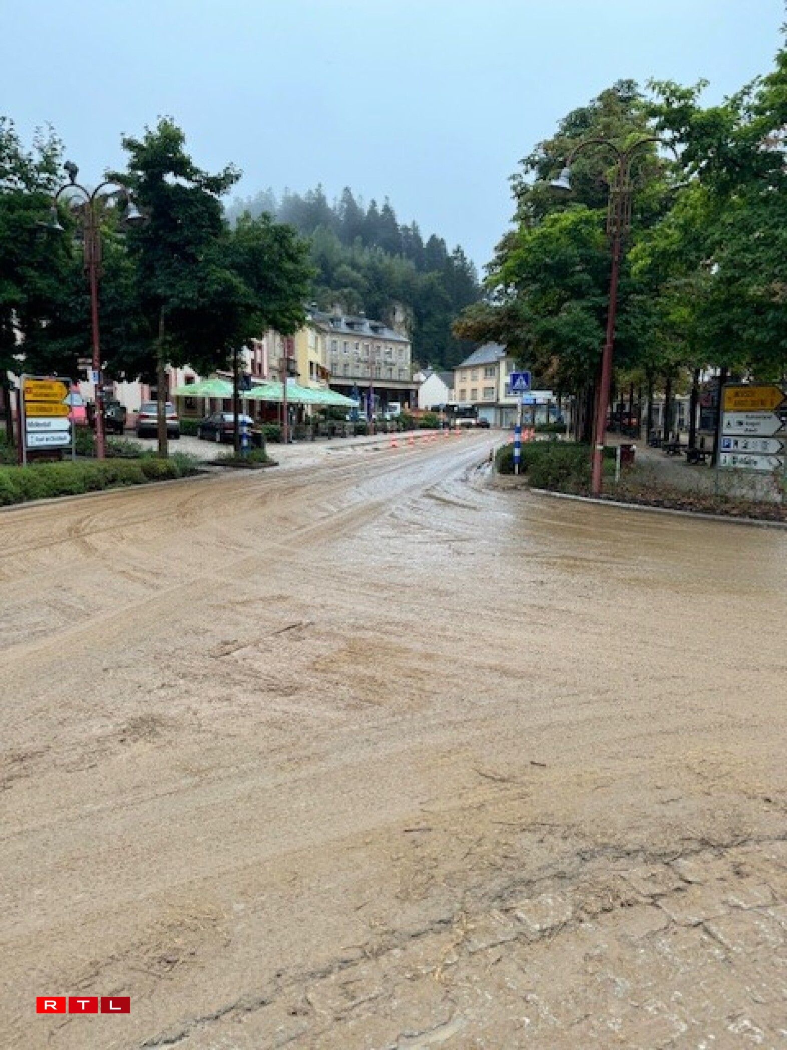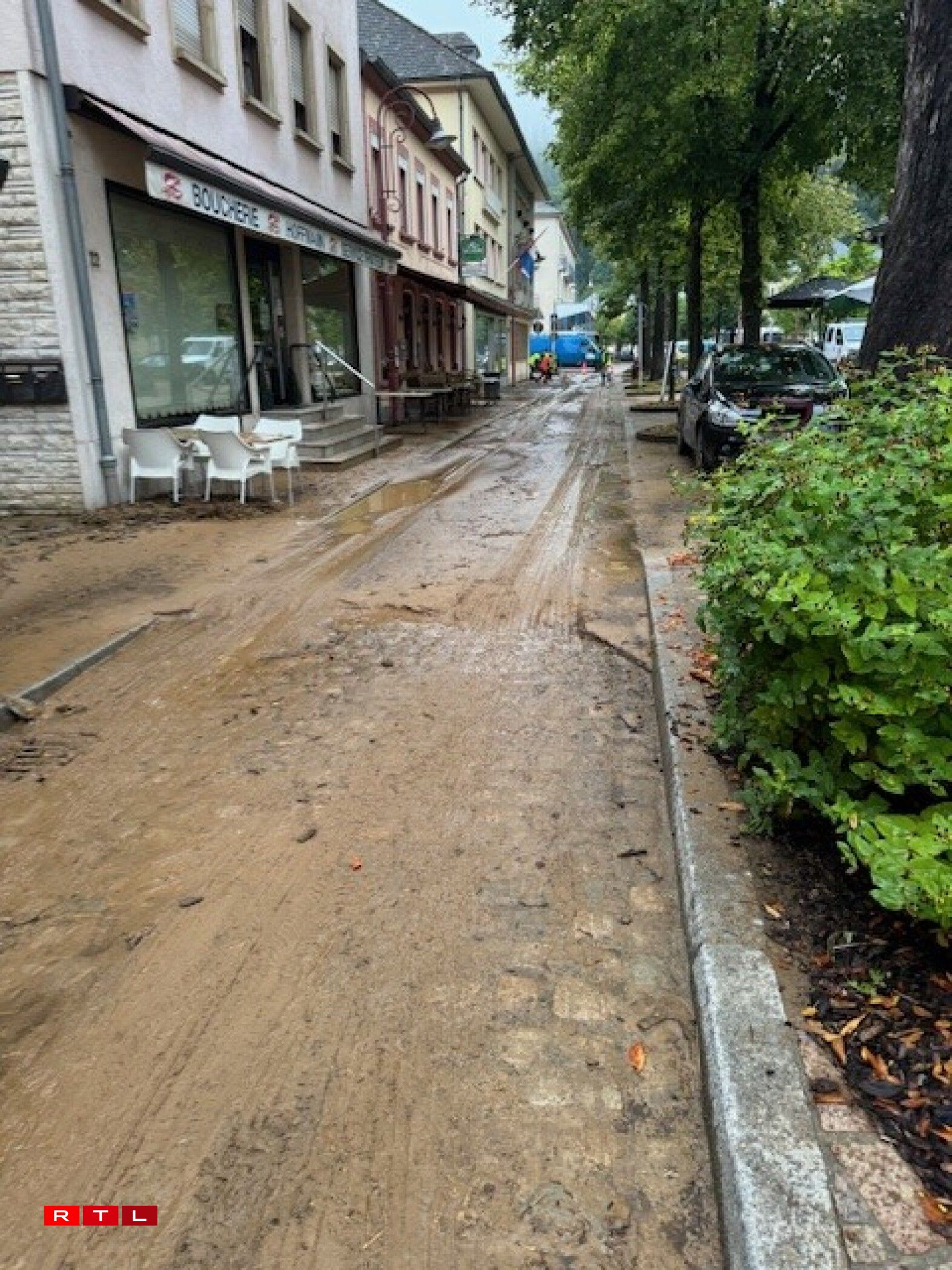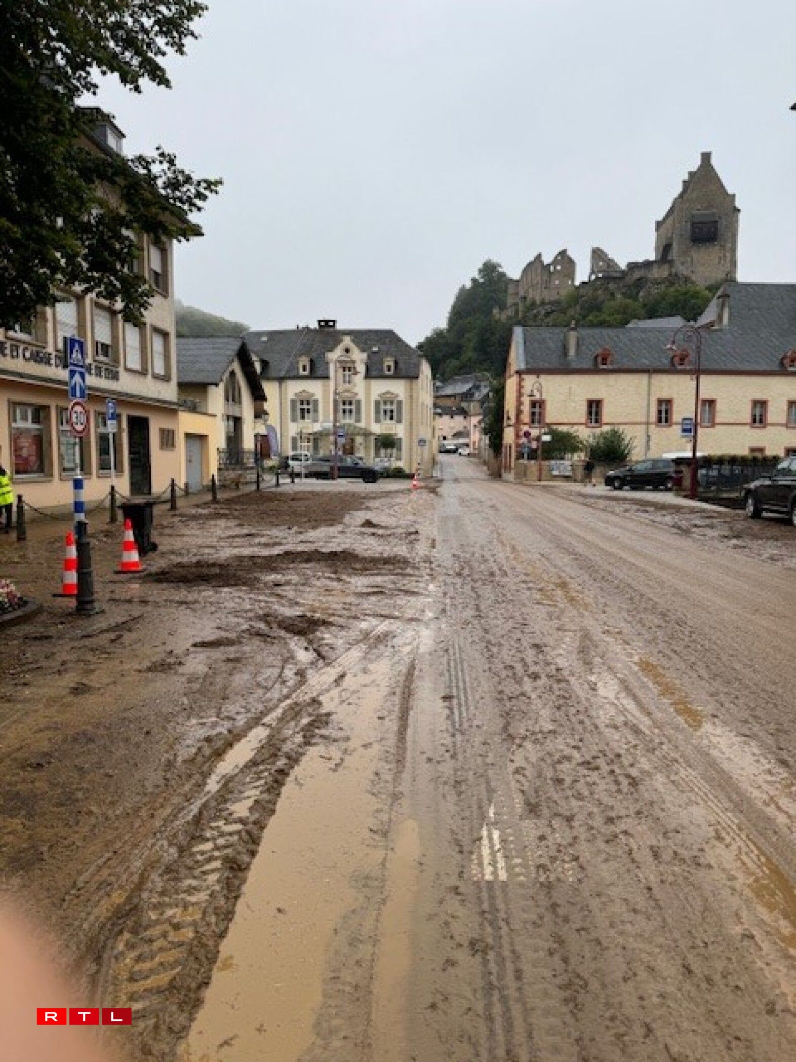 However, the impact of the mudslide extends beyond a single street. The main crossroads in Larochette, along with the surrounding streets, are entirely covered in mud, effectively bringing traffic in the town to a halt.