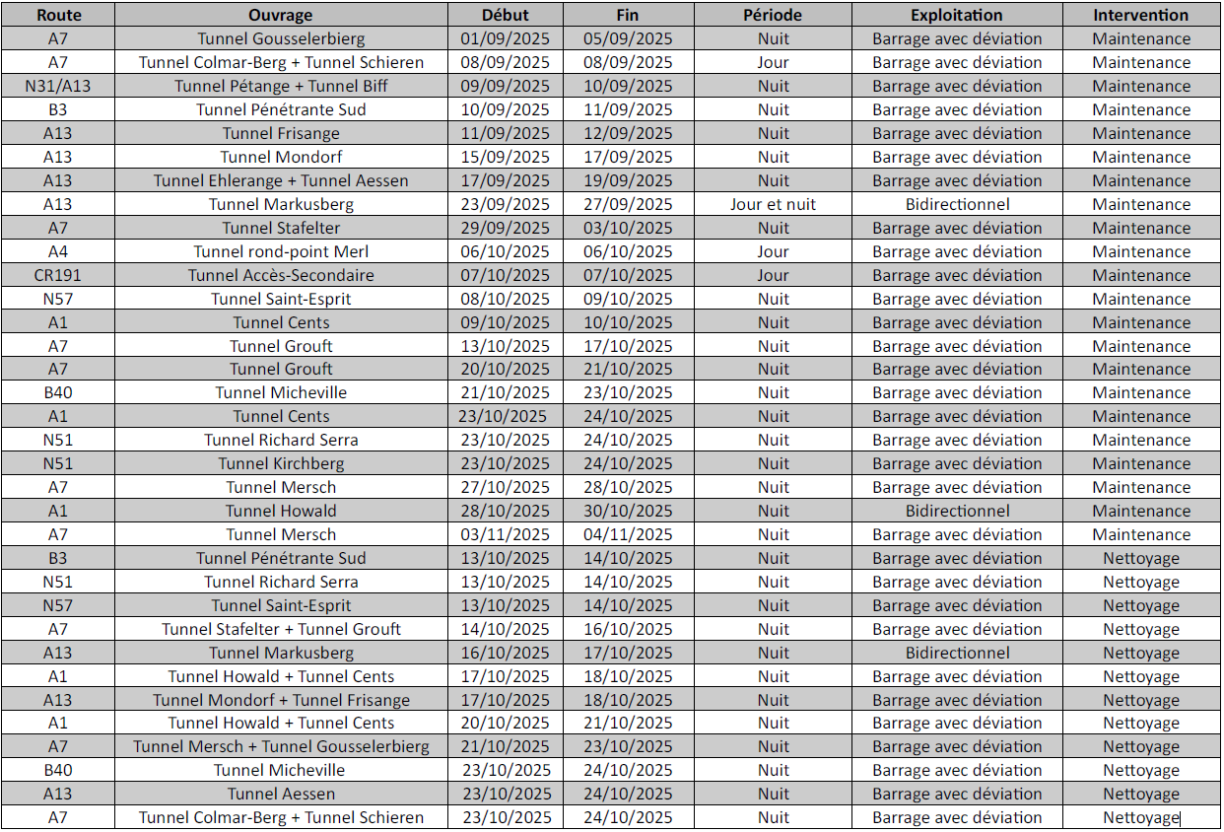 From 1 September until early November, night-time cleaning and maintenance will affect motorway tunnels across Luxembourg, leading to diversions, according to the Road Authority. The works mark the second maintenance and cleaning campaign of 2025, beginning with the Gousselerbierg tunnel. Preventive checks will be carried out on safety equipment, with damaged elements to be replaced and tunnels to be thoroughly cleaned.