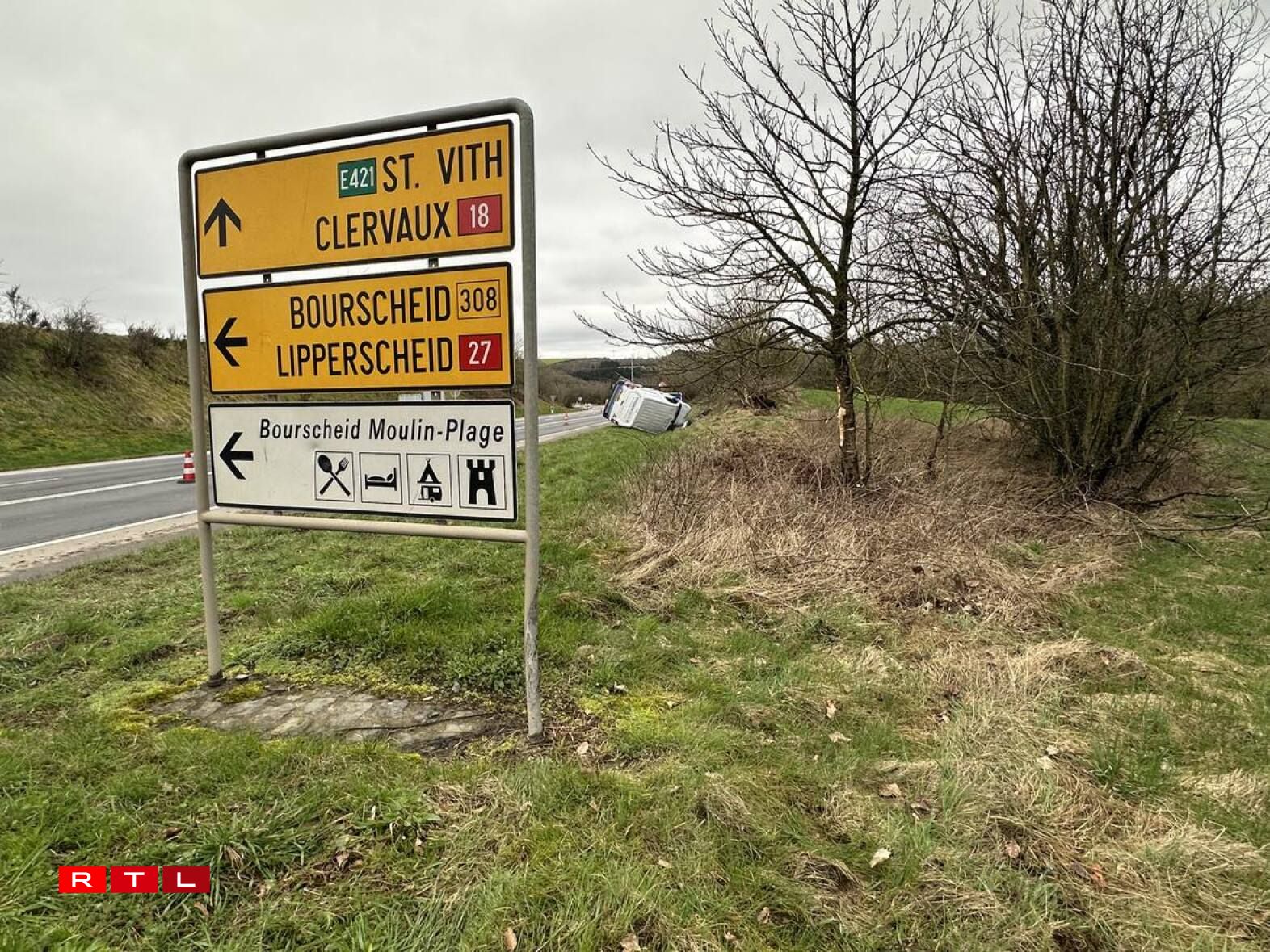 Upon impact, the van, travelling in the direction of Hosingen, veered off the road, ultimately colliding with a tree and overturning in a nearby ditch.