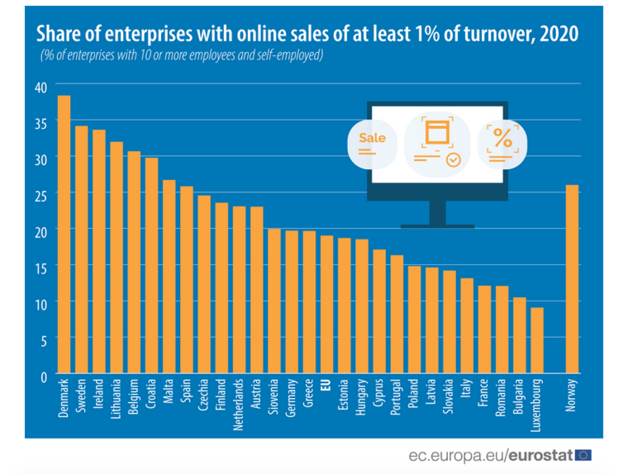 At the other extreme of this is Denmark, with 38% reporting at least one percent of their 2020 revenue online, followed by Ireland and Sweden with 34%. The highest increase year on year has been in Belgium and Finland, with 5 percent.