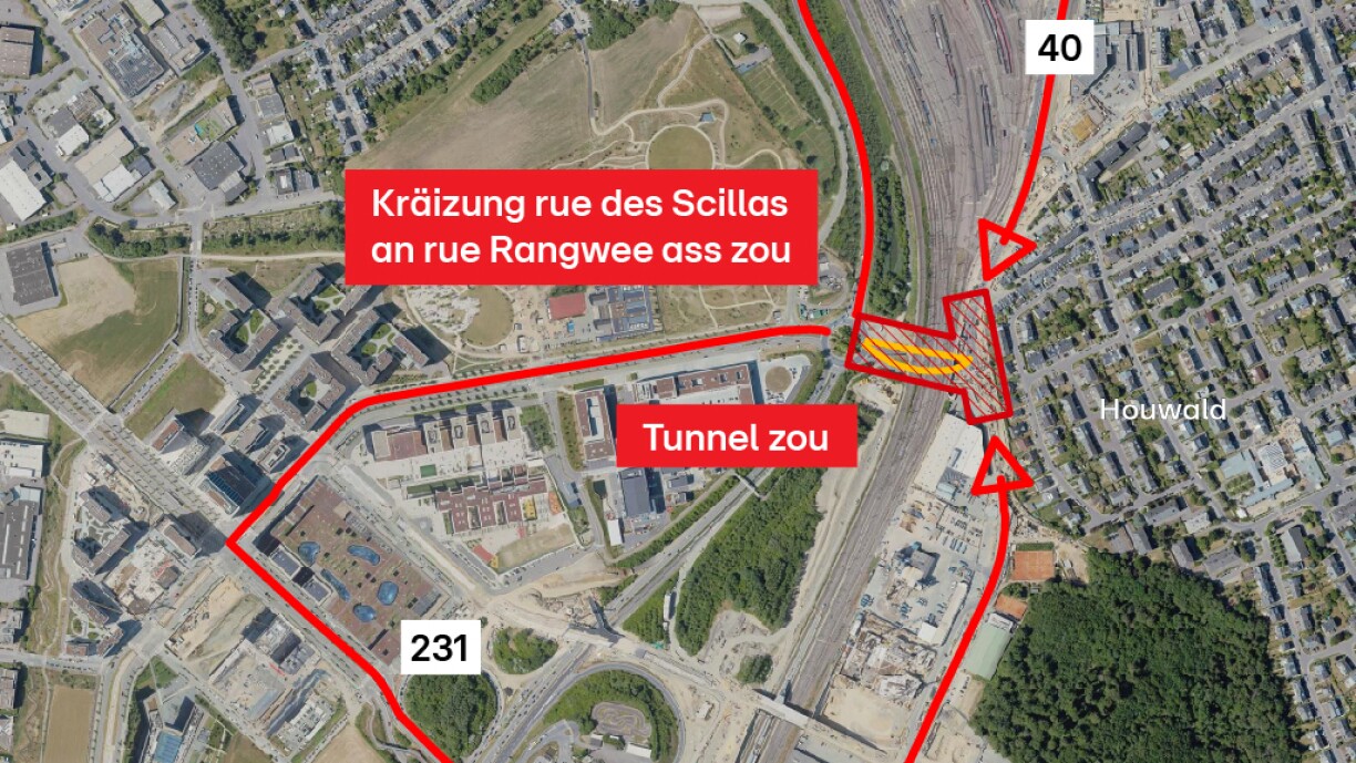 Due to redevelopment on Rue des Scillas, the intersection with Rue Rangwee and the Rangwee Tunnel in Luxembourg City will be shut in both directions, commencing at 9pm on Friday 24 May and reopening at 5am on Monday 27 May.