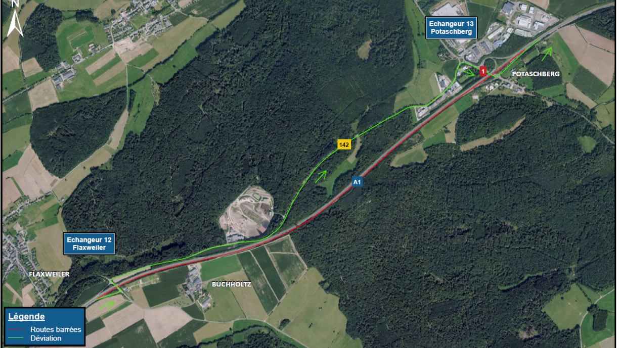 The motorway will therefore be shut to traffic between the Flaxweiler and Potaschberg interchanges in the direction of the German border. Traffic from the Grunewald junction towards Trier will be diverted from the Flaxweiler interchange via the CR142 and the N1 to the Potaschberg interchange.