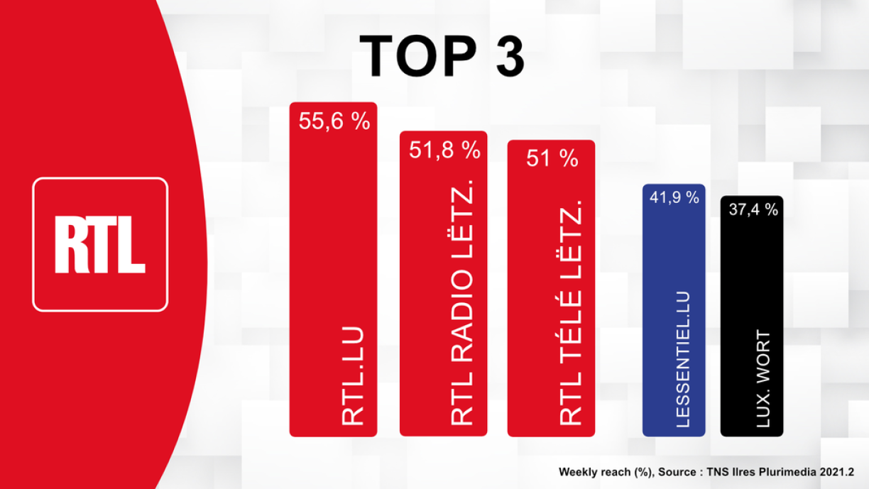 During one week period RTL.lu is the media which achieves the best coverage rate with 55,6 % of the population, ahead of RTL Radio Lëtzebuerg* (51,8 %) and RTL Télé Lëtzebuerg (51 %).
