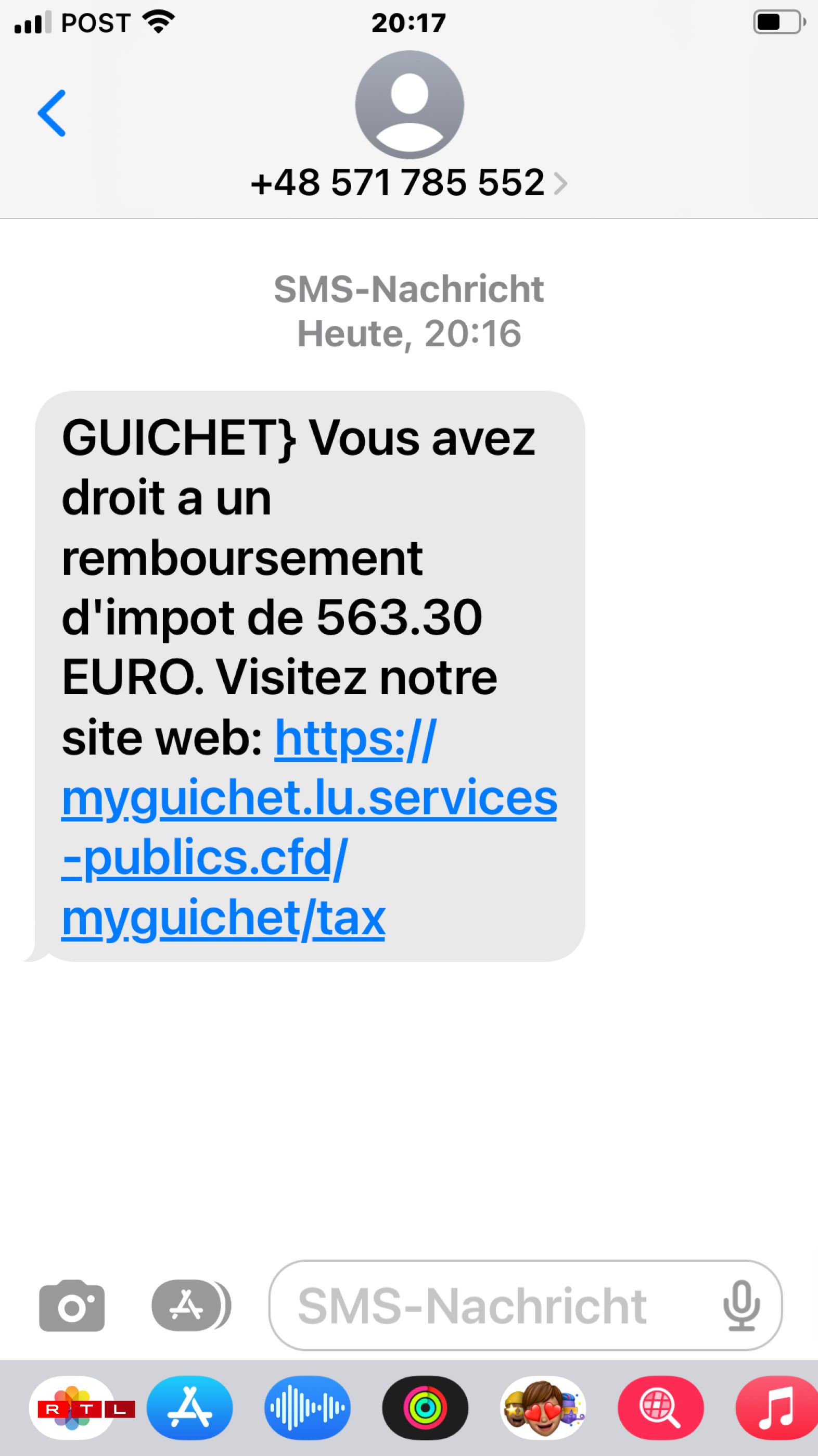 This rule applies to all scams circulating in Luxembourg, whether by text message or email. If you receive a message claiming you are entitled to a tax refund, it could therefore be linked to the fact that you were browsing the Guichet.lu portal.