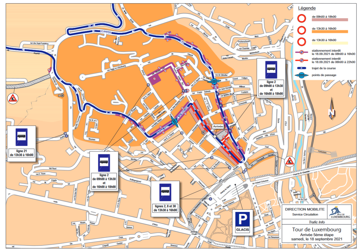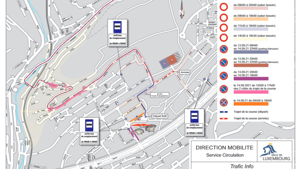 For a detailed overview with all relevant street closures and changes to public transport, please consider the official plan issued by the municipality of Luxembourg City, which you can find below.