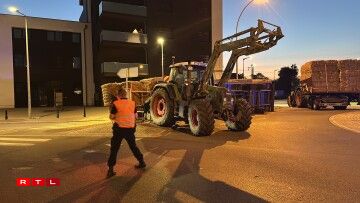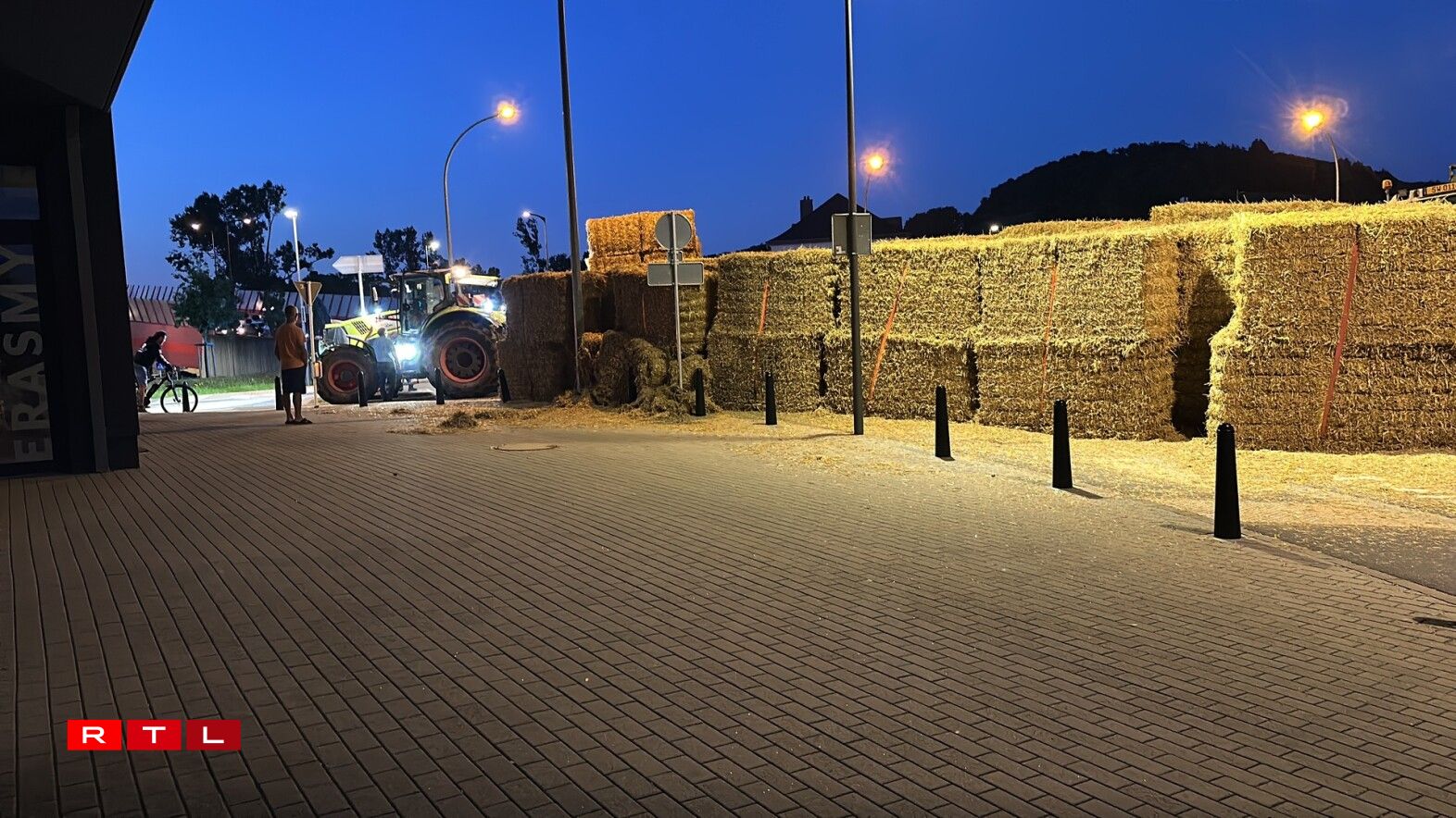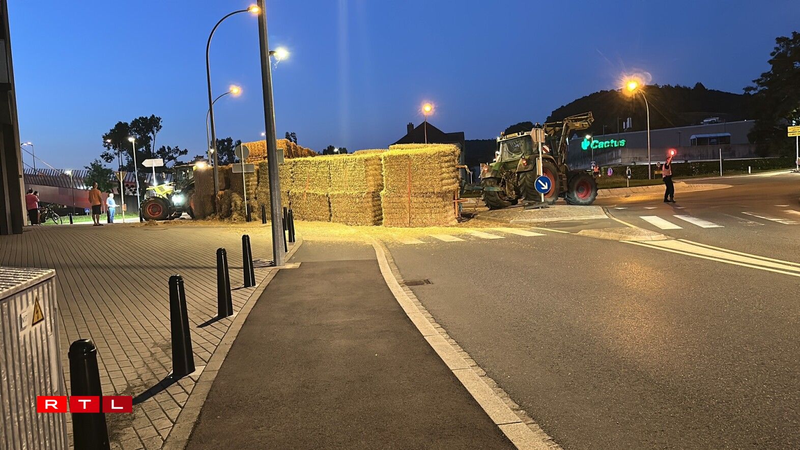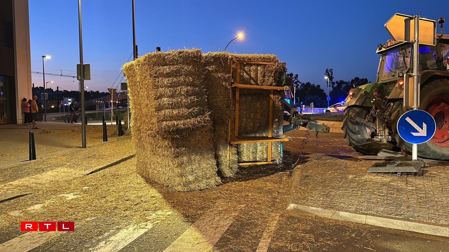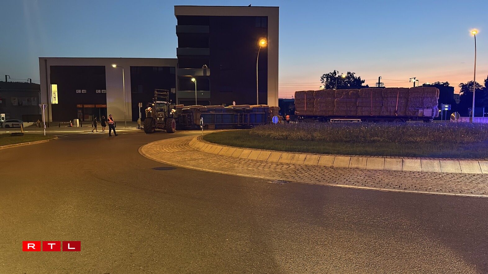 The roundabout near the Cactus supermarket in Mersch was closed on Sunday evening due to two tractors blocking the way, one of which had overturned its trailer loaded with bales.