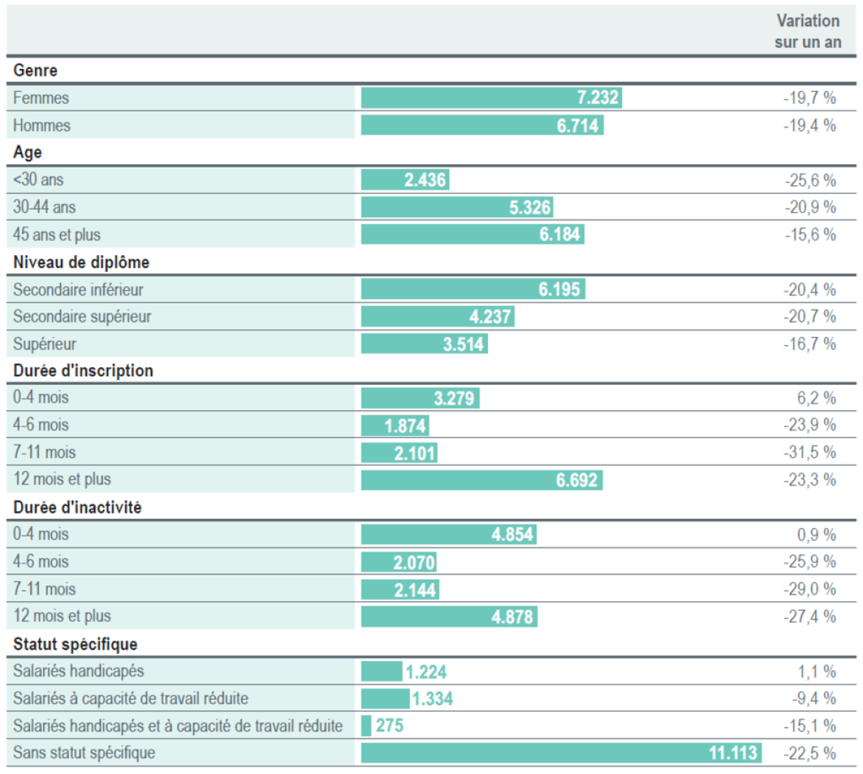 The number of those looking for employment was down across all categories, except for those registered with ADEM for a period shorter than four months. This category recorded a 6% increase.