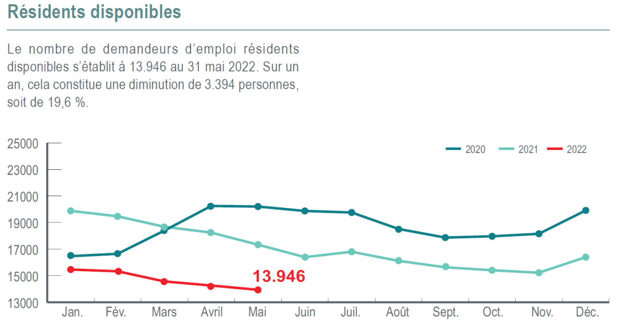 The number of jobseekers registered with ADEM was 13,946 as of 31 May 2022, down 19.6% compared to the same period last year.