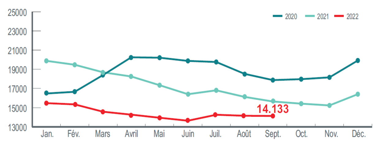The number of resident job seekers receiving full unemployment benefit fell by 820 people or 10.5% over one year, to 6,999. The number of beneficiaries of a measure stood at 4,133 and is below the level observed in September 2021 (-346 people, or 7.7%).