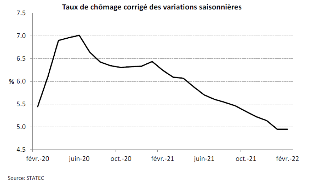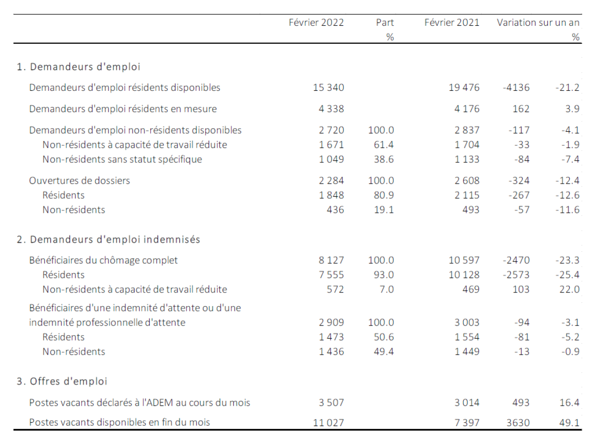 The number of new registrations remains low (1,850 residents last month). The last time the monthly rate for new ADEM registrations was this low was in 2018. The number of people completing occupational activities remained elevated at 4,300 in February, a plus of 4% compared to the previous year.