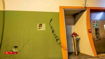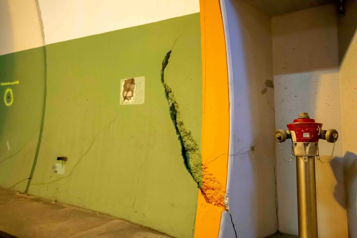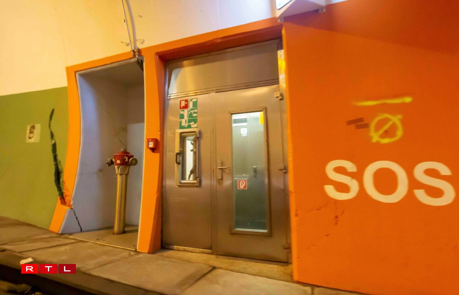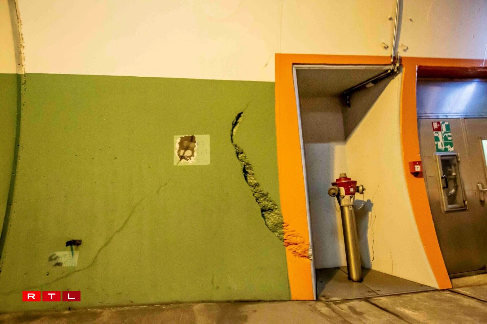 A closer look reveals that there is more to see than just the crevice, however. One can also detect a marking that indicates that authorities have already discovered the damage near the emergency exit. Furthermore, there are signs of an older and less extensive crack hidden under a layer of paint near the new one.