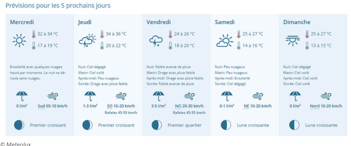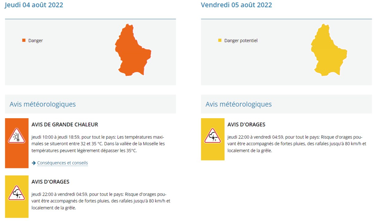 Meteolux have issued a high alert for the scorching temperatures expected between 1am and 7pm on Thursday. The thermometer will indicate 32°C-35°C, with temperatures exceeding 35°C in the Moselle Valley.