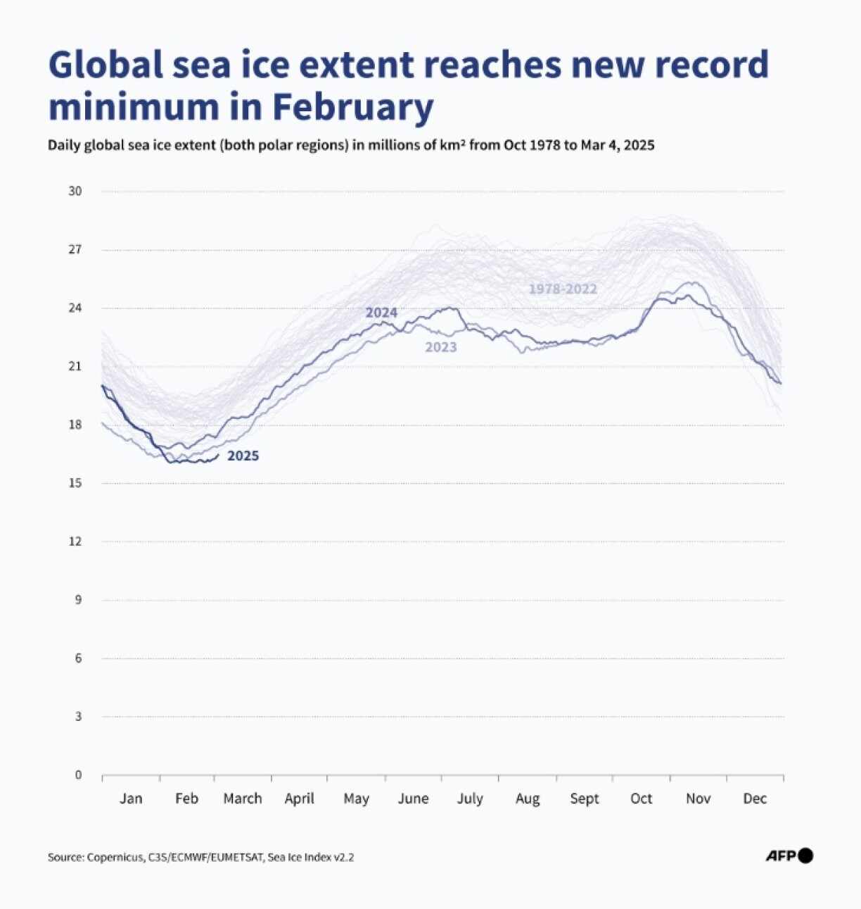 Combined Antarctic and Arctic sea ice cover -- ocean water that freezes and floats on the surface -- dropped to a record minimum extent of 16.04 million square kilometres (6.19 million square miles) on February 7, Copernicus said.
