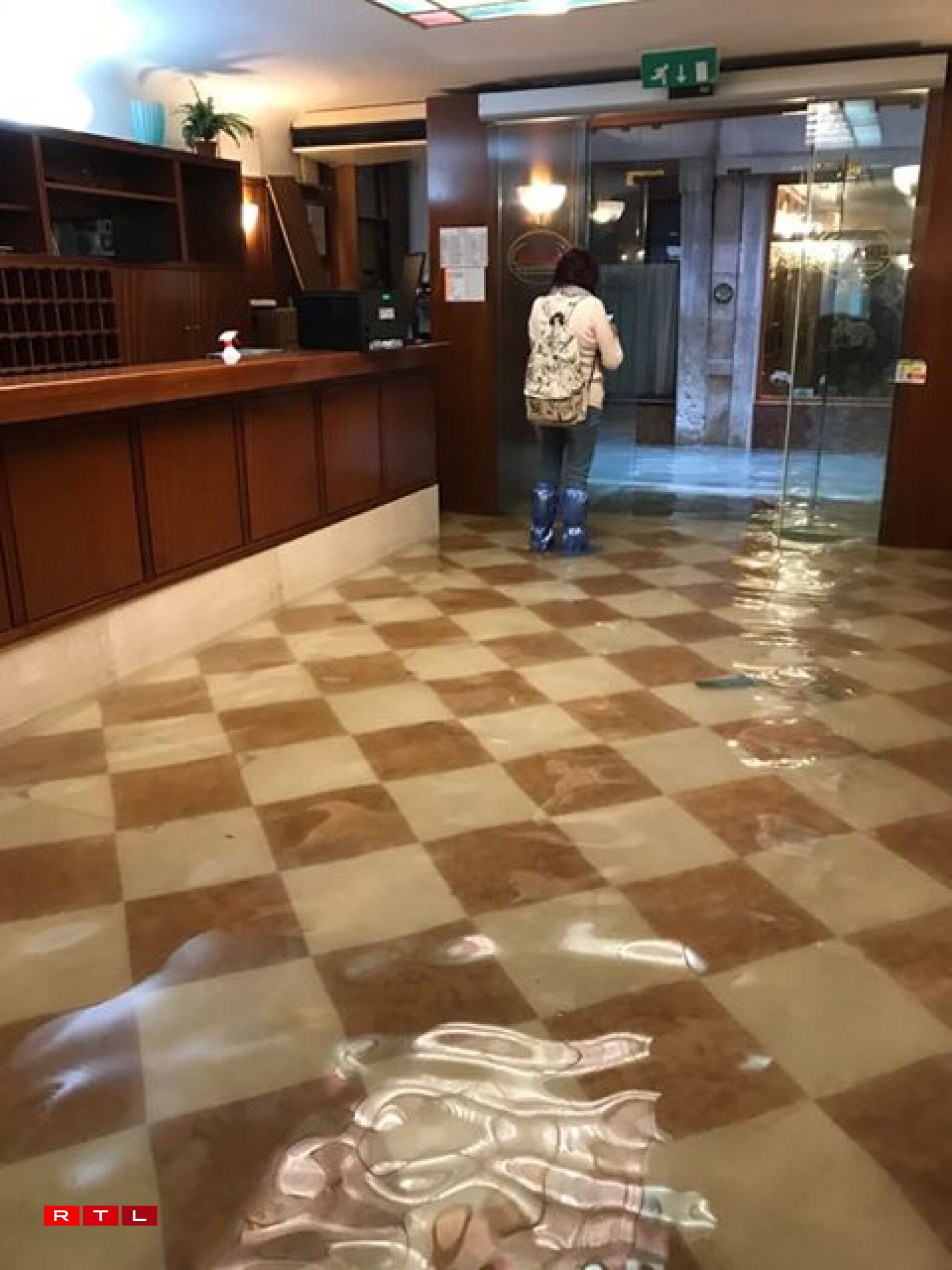 A flooded hotel lobby.