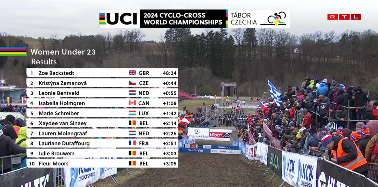 Nonetheless, Welsh cyclist Zoe Backstedt won her world champion title in quite a spectacular manner. Backstedt quickly gained a significatn lead over her competitors, navigating the muddy course with remarkable skill. As she crossed the finish line, she held a lead of 44 seconds over the Czech cyclist Kristyna Zemanova and 55 seconds over the Dutch competitor Leonie Bentveld. Schreiber maintained fourth position throughout the race, only being surpassed by another competitor shortly before the finish line ultimately finishing in fifth place with a gap of one minute and 42 seconds.