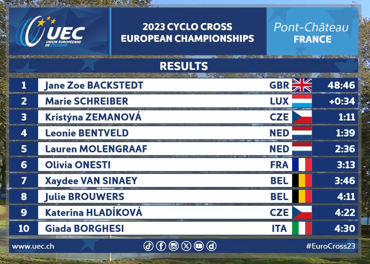 The Luxembourger was 34 seconds behind new European champion Zoe Backstedt after around 49 minutes of racing. Kristyna Zemanova rounded off the podium, taking bronze just one minute and 11 seconds behind.